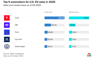 Via CNBC, U.S. sales of EVs, excluding hybrids, topped one million units through the first nine months of 2025, and set a new quarterly record of more than 438,000 units sold during the third quarter — achieving market share of 10.5% for the period — up from 7.4% during the second quarter and 7.6% during the first three months of the year. Sales of all-electric models were estimated to be 1.3 million in 2024, with about an 8% market share. Tesla had a 43.1% market share through September, down from 49% at the end of last year.