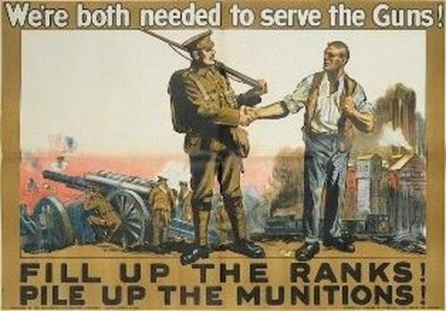 Great War poster depicting military and industry. Courtesy Bonhams.com.