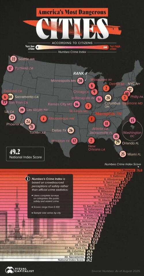 At the top of the list, Memphis, Tennessee registers the highest crime index score at 78, marking it as the city Americans perceive as the most unsafe in 2025.