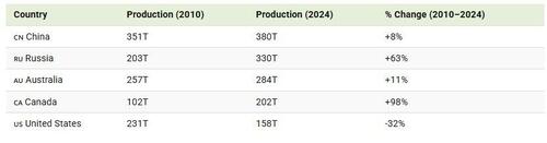 The U.S. is the only country in the top five to post a decline. In 2024, it produced 158 tonnes, down from 231 tonnes in 2010—a 32% drop. Environmental regulations, lower ore grades, and the closure of key mines have all contributed to this decline, pushing the U.S. to fifth place globally.