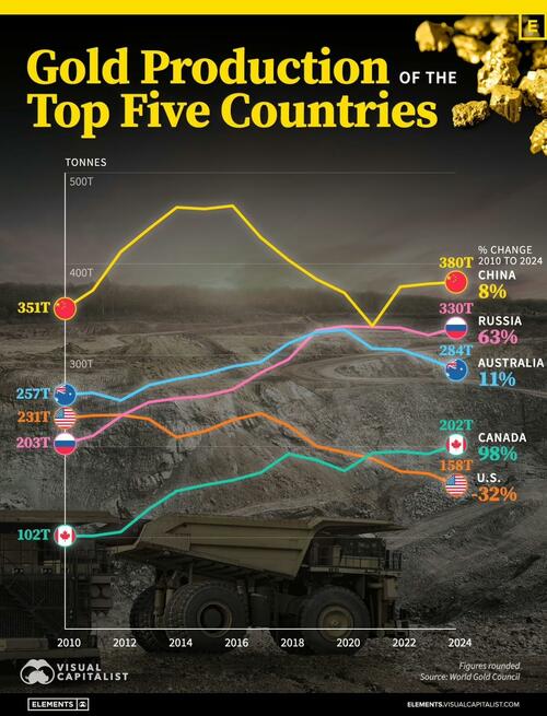 Global demand for gold has remained strong over the last decade, driven by central bank reserves, investment demand, and jewelry consumption. This infographic tracks the five largest gold-producing countries from 2010 to 2024, highlighting shifts in output and global rankings.