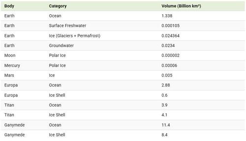 This visualization from Made Visual Daily, via Visual Capitalist, compares all known and estimated bodies of water in our solar system, including those beneath the surface, on a volumetric scale.