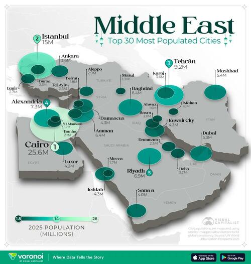 Cairo ranks as the Middle East’s most populated city, with more than 25.5 million residents in 2025. The Egyptian capital has expanded steadily for decades, driven by high birth rates and sustained migration from rural areas. Alexandria and several other Egyptian cities also rank highly.