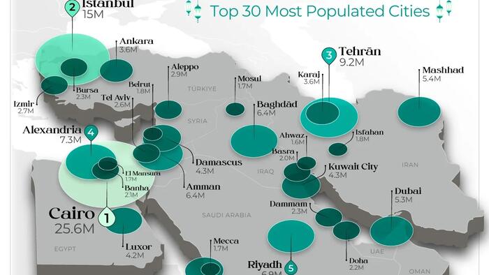 Cairo ranks as the Middle East’s most populated city, with more than 25.5 million residents in 2025. The Egyptian capital has expanded steadily for decades, driven by high birth rates and sustained migration from rural areas. Alexandria and several other Egyptian cities also rank highly.
