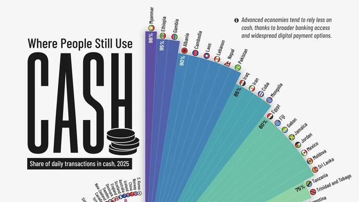 This infographic, via Visual Capitalist’s Pallavi Rao, ranks 123 countries by the share of daily transactions completed with physical banknotes and coins, spotlighting where cash is still king, and where it’s becoming a relic.