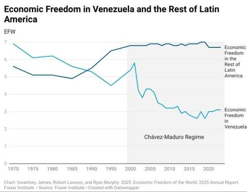 In 1970, Venezuela scored a little less than 7 on the Fraser Institute’s 10-point Economic Freedom of the World index, making it the 13th most economically free country in the world, just ahead of Japan.