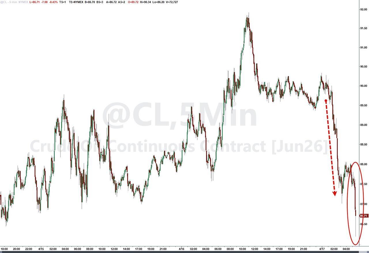 WTI Crude front-month oil futures prices are tumbling on the report, down over 8% – back near post-ceasefire lows…