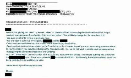 May 2016: The New York field office receives a call from FBI headquarters on behalf of Director Comey, instructing them to “cease and desist” from the Clinton Foundation investigation.