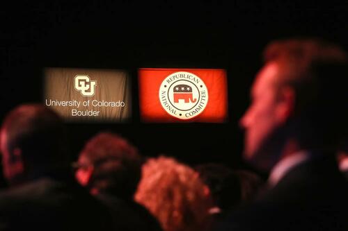 Audience members watch the CNBC Republican Presidential Debate at the University of Colorado’s Events Center in Boulder, Colo., on Oct. 28, 2015. The Federal Election Campaign Act, which imposes limits on coordinated expenditures by political parties and candidates, was challenged in 2022 by a lawsuit questioning whether those limits violated the First Amendment. Justin Sullivan/Getty Images