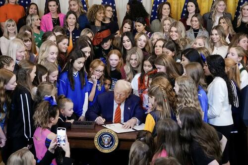 President Donald Trump, joined by female athletes, signs the “No Men in Women’s Sports” executive order in the White House on Feb. 5, 2025. Andrew Harnik/Getty Images