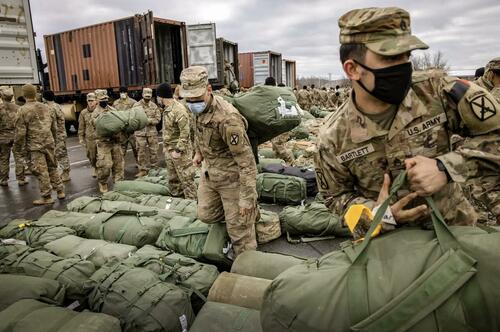 U.S. Army soldiers retrieve their duffel bags after they return home from a nine-month deployment to Afghanistan at Fort Drum, N.Y., on Dec. 10, 2020. The Supreme Court is expected to consider whether defense contractors can be sued for liability over terrorist attacks in foreign countries. John Moore/Getty Images
