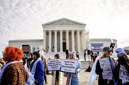 Protesters gather in front of the Supreme Court as the court hears a case over banning gender procedures for minors, in Washington on Dec. 4, 2024. Madalina Vasiliu/The Epoch Times
