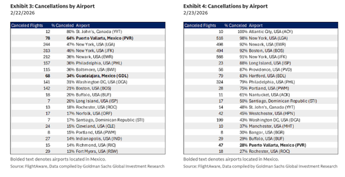 Bottom line: There were significant cancellations in select airports following the events in Mexico over the weekend; however, these cancellations were in-line with or lower than cancellations at airports impacted by Winter Storm Hernando. Separate from the cancellations over the last couple days, the larger question in our view is if there will be a lasting impact on demand. We take no view on the length of the unrest in Mexico. While not directly comparable, we note that other recent geopolitical events have had a short-lived impact, if any, on demand for travel. As such, while there could be an impact from recent events, we could see the dissipation of demand headwinds fairly quickly if the situation is resolved (Volaris, one of the largest airlines in Mexico, resumed normal operations Monday 2/23). In the short-term, Sun Country has the highest exposure to Mexico, with ~10% of 1Q 2026 capacity scheduled to fly to various airports in Mexico. We note that February and March in particular represent seasonally high demand months for North to South travel to warm weather destinations as various regions of the US have spring breaks over this period. It is possible that some trips planned for Mexico could instead be re-booked to a domestic warm weather destination or elsewhere in Latin America/the Caribbean if there are lingering concerns around Mexico over the next couple months.