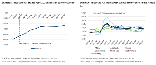 Recent geopolitical events showed short-lived impact to demand. While not directly comparable, if we look to two recent events we see potential for limited lasting impact to air travel demand. For example, while likely complicated by the broader post-pandemic recovery, following the events in Russia/Ukraine in February 2022, global air travel continued to recover (see Exhibit 5) and Delta had not seen any impact for travel to broader Europe as of April 2022. Following the events on October 7, 2023 in the Middle East, there was similarly a limited lasting impact to air travel (Exhibit 6; year-over-year global industry air traffic growth continued to improve following October 2023, and while there was a step-down in Middle Eastern air traffic growth in November and December 2023, January 2024 saw a marked step-up in traffic growth. We acknowledge each event may be different, and look for evidence of whether any potential demand headwind will similarly dissipate fairly quickly.