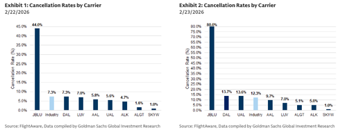 Cancellations were elevated on Sunday 2/22 and Monday 2/23, but largely driven by Winter Storm Hernando. On Sunday 2/22 and Monday 2/23, the industry saw an elevated level of cancellations, some of which were related to the ongoing unrest in Mexico, but with the majority driven by Winter Storm Hernando (see Exhibit 1 and Exhibit 2). For example, JetBlue had significantly higher cancellations than its peers on 2/22, with 44% of flights canceled vs. its competitors canceling less than 10% of flights, but JetBlue has