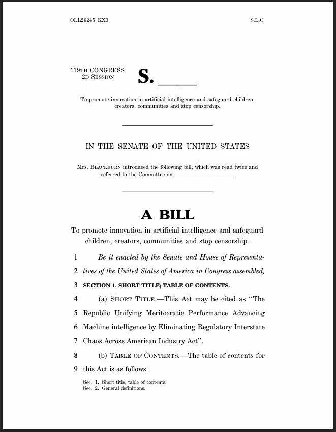 U.S. Senator Marsha Blackburn has released a 291-page legislative framework that would repeal Section 230, expand liability across the artificial intelligence ecosystem, and establish a unified federal rulebook governing how AI systems are built, deployed, and controlled in the United States.