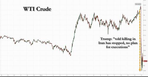 There are reports that President Trump is listening to the non-interventionists in his cabinet, as he says Thursday afternoon he’s been told that the killing in Iran is stopping, and no plan for executions. WTI futures immediately dropped on the newswires: