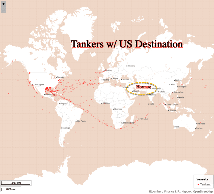 In fact, the latest vessel-tracking data transmitted via the Automatic Identification System, supplied by Bloomberg, show that it is quite possible that America has become the world’s emergency gas station.