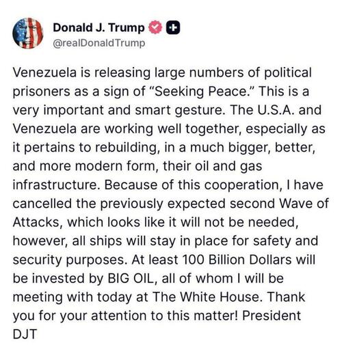 Trump Cancels 2nd Wave Of Strikes On ‘Cooperative’ Venezuela – Political Prisoners Freed