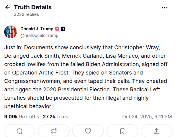 Just in: Documents show conclusively that Christopher Wray, Deranged Jack Smith, Merrick Garland, Lisa Monaco, and other crooked lowlifes from the failed Biden Administration, signed off on Operation Arctic Frost. They spied on Senators and Congressmen/women, and even taped their calls. They cheated and rigged the 2020 Presidential Election. These Radical Left Lunatics should be prosecuted for their illegal and highly unethical behavior!