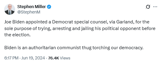 As for Miller’s claim that appointing someone for the sole purpose of trying, arresting, and jailing a political opponent is authoritarian, you say? Huh. Hey Stephen, did you see that your boss just appointed his personal attorney for the sole purpose of prosecuting a political enemy?
