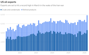Even with the United States being the world’s number one oil producer, U.S. gasoline prices have increased by more than 30% this month and could reach $4 a gallon, averaging $3.96 on March 23, according to AAA. Asia and Europe are turning to alternative sources for oil, refined fuels, and natural gas, drawing more U.S. fuels into the international market and tightening supplies at home. Offshore Engineer reports that U.S. oil exports are expected to reach a record 4.6 million barrels per day in March, and exports of refined products, mainly gasoline and diesel, are expected to reach a high of about 3.2 million barrels per day.