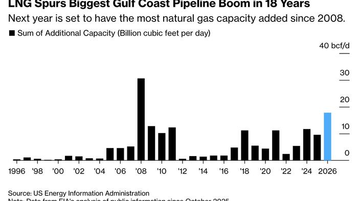 As many as a dozen projects are slated for completion next year, enough to boost the region’s gas-shipping capacity by 13%—roughly the equivalent of Canada’s total consumption, according to US Energy Information Administration data.