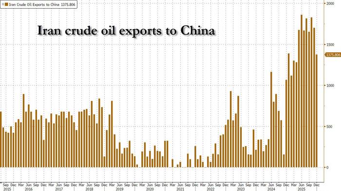 In a day that was already flooded by a relentless firehose of newsflow, Trump added to the leaning tower of chaos when said on Truth Social that he was imposing a 25% tariff on goods from countries “doing business” with Iran (most notably China which is its largest oil client), ratcheting up pressure on the government in Tehran that has been rocked by widespread protests.