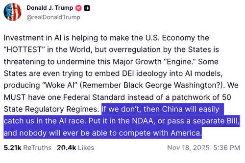 He continued, “We are beating ALL COUNTRIES at this point in the race, but that won’t last long if we are going to have 50 States, many of them bad actors, involved in RULES and the APPROVAL PROCESS. THERE CAN BE NO DOUBT ABOUT THIS! AI WILL BE DESTROYED IN ITS INFANCY!“