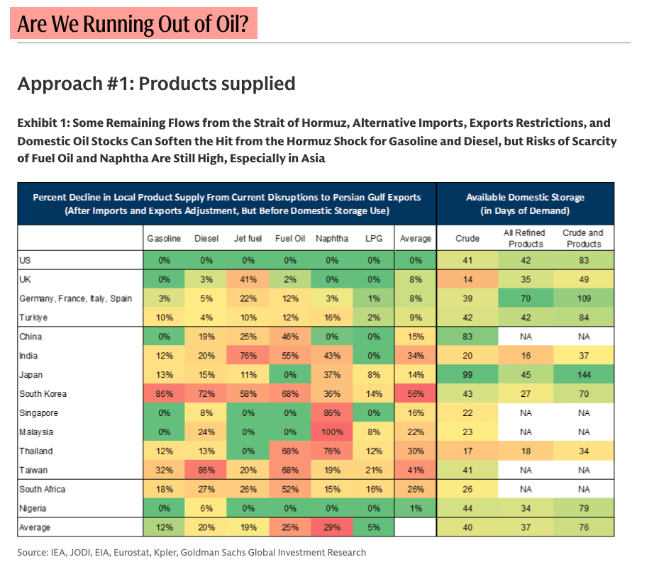 In commodity markets, the ongoing energy shock, with crude and LNG facilities across the Gulf area disrupted and the Hormuz chokepoint still clogged, prompted Goldman analyst Yulia Zhestkova Grigsby to ask on Friday evening: “Are We Running Out Of Oil?”