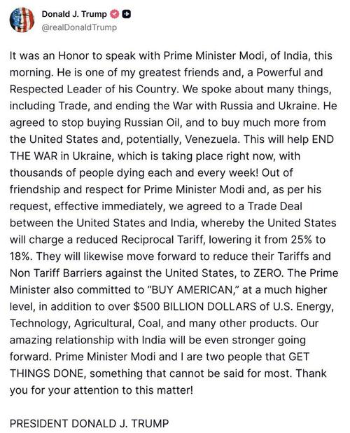 In a huge Monday development, President Trump has announced the US will trim its punitive 25% tariff on Indian imports to 18% after striking what he hailed as a new “trade deal” with Indian Prime Minister Narendra Modi. Crucially it hinges on New Delhi having reportedly ended its purchases of Russian crude and swapping them for massive US energy and goods buys.