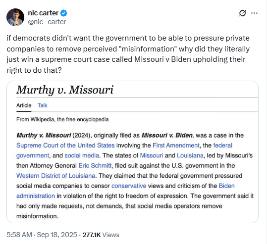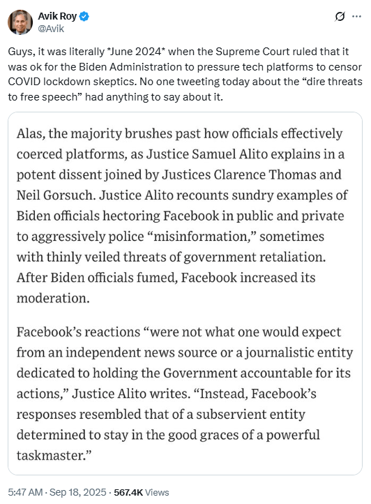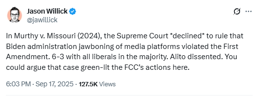 Trump supporters cycled through increasingly desperate explanations for why the Jimmy Kimmel situation was totally legitimate. First came the absurd “low ratings” defense—because sure, networks routinely cancel shows minutes before taping due to sudden ratings revelations and just hours after the chair of the FCC threatens them with “we can do this the easy way or the hard way.” And also, if it was low ratings, how do you explain why they brought the show back after less than a week? When that collapsed under basic scrutiny, they pivoted to something even more dishonest: claiming Brendan Carr’s explicit threats to Disney are somehow identical to what the Biden administration did, and falsely claiming this makes hypocrites of those who agreed with the ruling in Murthy v. Missouri.
