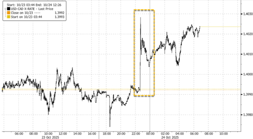 In markets, UBS analyst Jason Poh told clients that “USDCAD has a knee-jerk jump, 30+ pips” after Trump announced all trade talks were terminated.