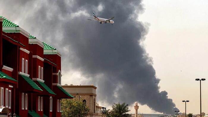 AFP/Getty Images: Emirates aircraft prepares for landing as a smoke plume rises from an ongoing fire near Dubai International Airport on March 16