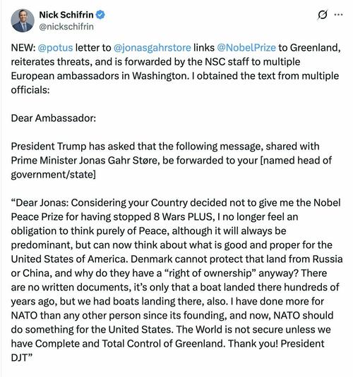 But confirmation came soon after. In the letter addressed to Norwegian Prime Minister Jonas Gahr Store, Trump explained that he no longer feels obligated to focus exclusively on peace, while repeating his intent for US control over Greenland. In essence he lays out that no Nobel might turn into no Greenland for Europe (as Denmark exercises control over the resource-rich autonomous territory).
