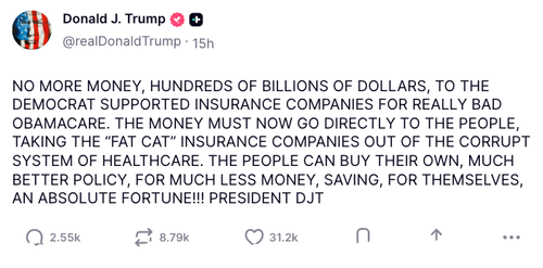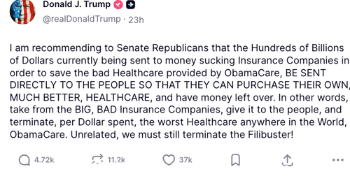 By Saturday morning, Trump posted another message on Truth Social, calling for redirecting federal funds that Democrats want to funnel into the bank accounts of big insurance companies, and instead sending those payments directly to Americans as a way not just to end the shutdown but fix the healthcare affordability crisis fueled by Obamacare. The president wrote: