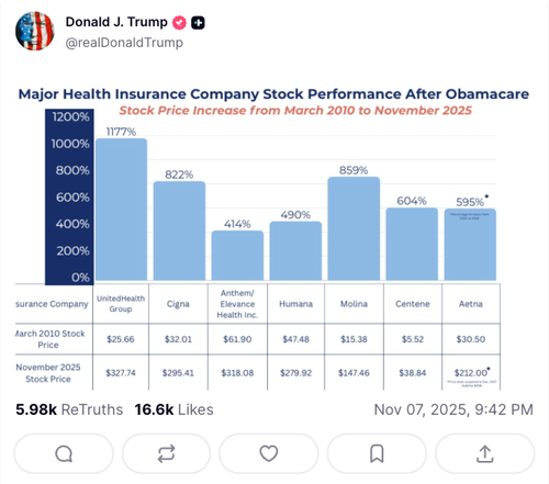 On Friday, the president posted on X that the insurance-industrial complex, aligned with the Democrats, has seen stock gains soar between 400% and nearly 1,200% since Obamacare was introduced. Meanwhile, the promise of lower healthcare costs under the ACA turned out to be an illusion, as Democrats pushed toward socialized healthcare while serving corporate interests first, not working-class families.