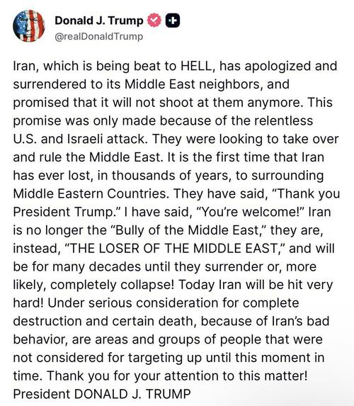 He also claimed Tehran had effectively backed down in the region, saying Pezeshkian had “surrendered” to neighboring countries and “promised that it will not shoot at them anymore.” According to Trump, “This promise was only made because of the relentless U.S. and Israeli attack.”