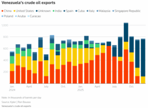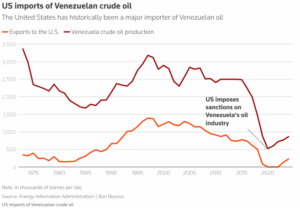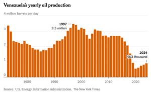 Venezuelan crude once flowed heavily into the United States, peaking at 1.4 million barrels a day in 1997, when the shipments accounted for nearly half of the country’s oil production, according to the Energy Information Administration. That trade eroded steadily over the following two decades, falling to about 506,000 barrels a day by 2018. After Washington imposed sanctions on Venezuela’s oil industry in 2019 in response to President Nicolás Maduro’s disputed re-election, U.S. purchases dropped to negligible levels.