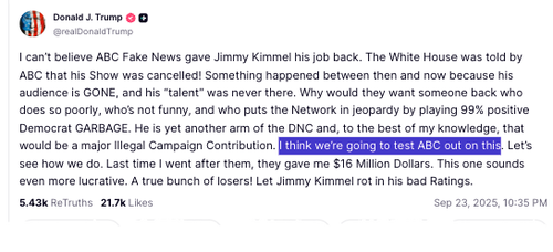 I think we’re going to test ABC out on this. Let’s see how we do. Last time I went after them, they gave me $16 Million Dollars. This one sounds even more lucrative. A true bunch of losers! Let Jimmy Kimmel rot in his bad Ratings.