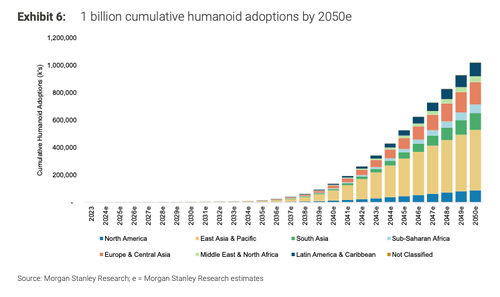 Last week, Morgan Stanley analyst Shawn Kim showed clients that adoption of humanoid robots will top 1 billion units by 2050.