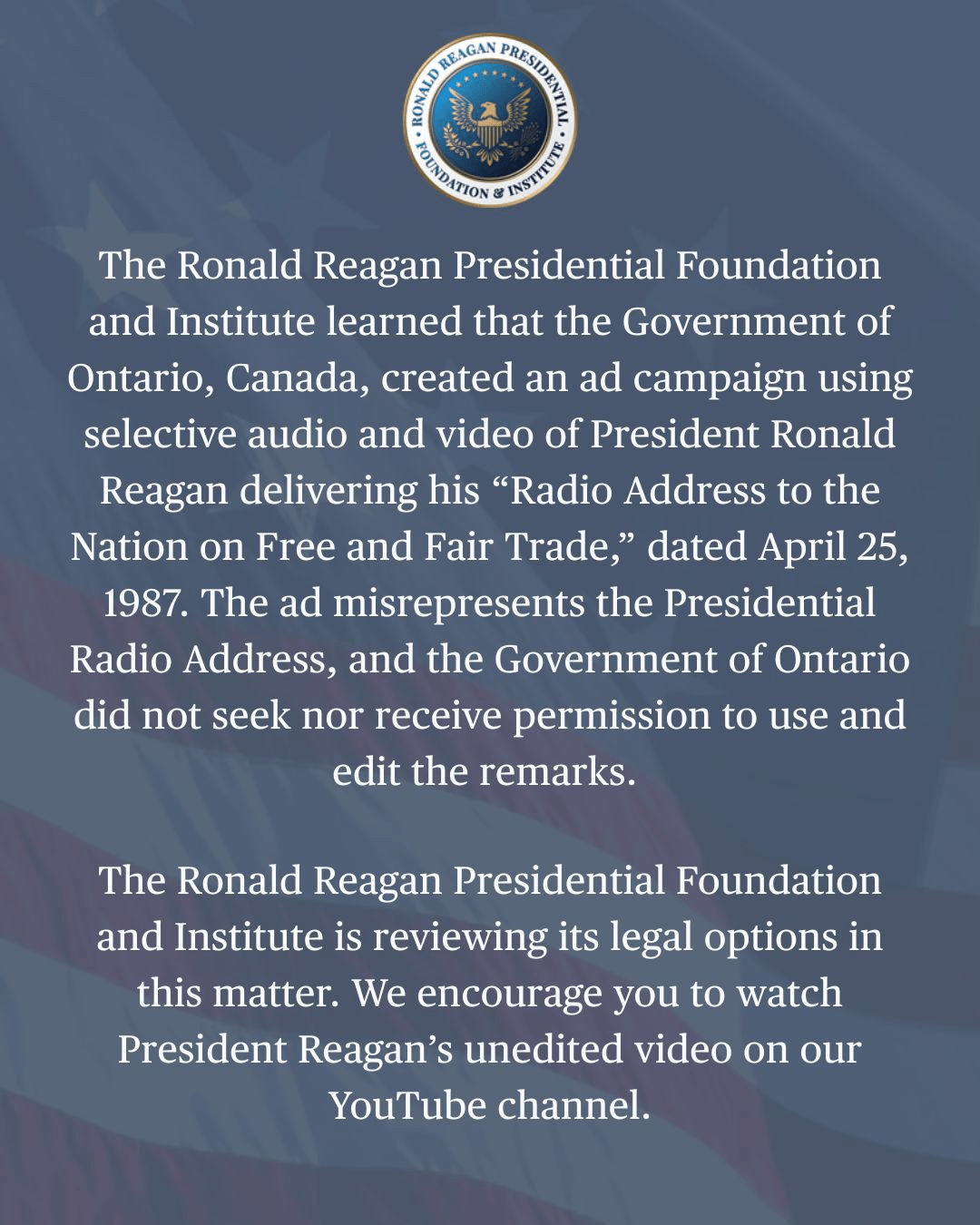 The Ronald Reagan Presidential Foundation and Institute learned that the Government of Ontario, Canada, created an ad campaign using selective audio and video of President Ronald Reagan delivering his “Radio Address to the Nation on Free and Fair Trade,” dated April 25, 1987. The ad misrepresents the Presidential Radio Address, and the Government of Ontario did not seek nor receive permission to use and edit the remarks.