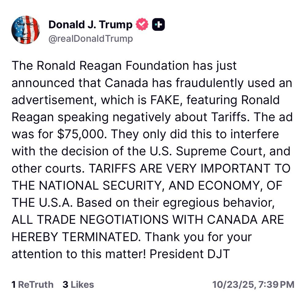 The Ronald Reagan Foundation has just announced that Canada has fraudulently used an advertisement, which is FAKE, featuring Ronald Reagan speaking negatively about Tariffs. The ad was for $75,000. They only did this to interfere with the decision of the U.S. Supreme Court, and other courts. TARIFFS ARE VERY IMPORTANT TO THE NATIONAL SECURITY, AND ECONOMY, OF THE U.S.A. Based on their egregious behavior, ALL TRADE NEGOTIATIONS WITH CANADA ARE HEREBY TERMINATED. Thank you for your attention to this matter! President DJT