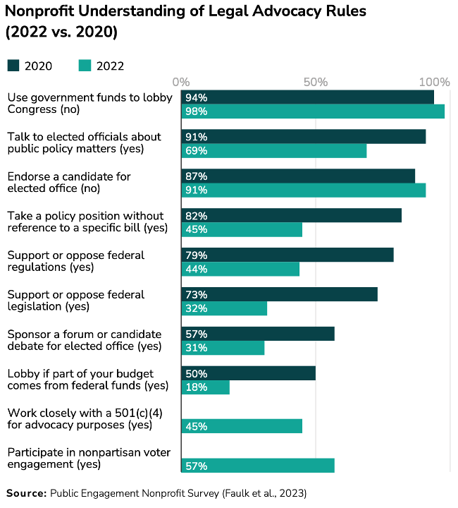 In 2022, the dataset from which this documentation comes additionally includes answers to new questions about nonprofits’ understanding of their ability to “[w]ork closely with a 501(c)(4) for advocacy purposes” and “[p]articipate in nonpartisan voter engagement.”