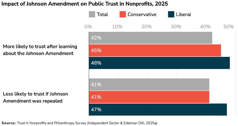 “When the Johnson Amendment is explained to respondents,” the IS report continues, “a plurality of both liberal and conservative respondents say the existence of the rule makes them more likely to trust nonprofits and repealing it would make them less likely to trust nonprofits,” as the below chart from the report shows.