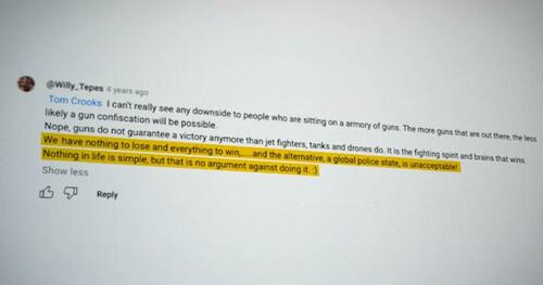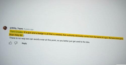 Then – a YouTube user @Willy_Tepes began seemingly encouraging Crooks… writing “If a gun and a badge is all that is needed, then authority obviously comes from the barrel of a gun. We have more guns than they do ;)”