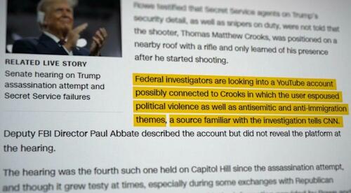 Two and a half weeks after the attack, a ‘source familiar with the investigation’ told CNN that “Federal investigators are looking into a YouTube account possibly connected to Crooks in which the user espoused political violence as well as antisemitic and anti-immigration themes.