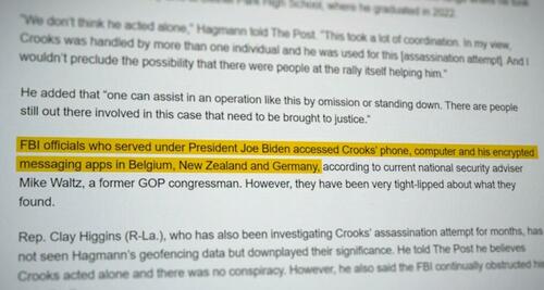 • Biden FBI officials accessed Crooks’ phone using software from an Israeli firm, Cellebrite, and accessed his phone, computer and his encrypted messaging apps in Belgium, New Zealand and Germany – “yet none of the online activity the FBI discovered was referred to in any way in the final Congressional report.”
