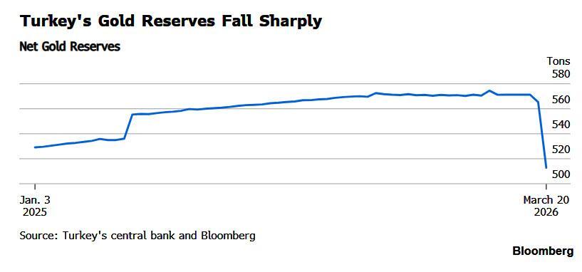 Today we learned the identity of at least one of the sellers: Turkey’s central bank sold and swapped about 60 tons of gold, worth more than $8 billion, or more than 10% of the country’s total holdings, in two weeks after the start of the war in Iran, adding to the sharp downward pressure on bullion prices.
