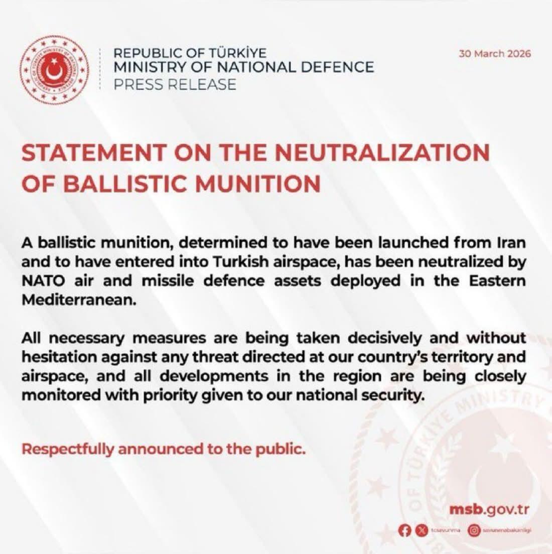 The intercept was carried out by air and missile defense assets positioned in the Eastern Mediterranean, according to the Turkish defense ministry, which offered no further initial details concerning trajectory, type, or what the intended target ultimately was.